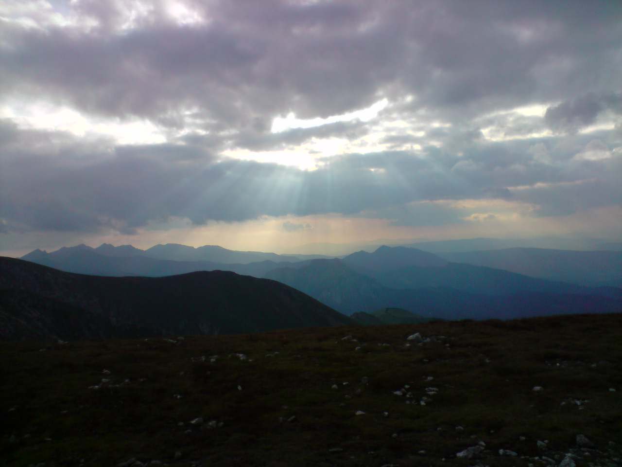Promienie słońca wychodzące zza chmur nad górami.